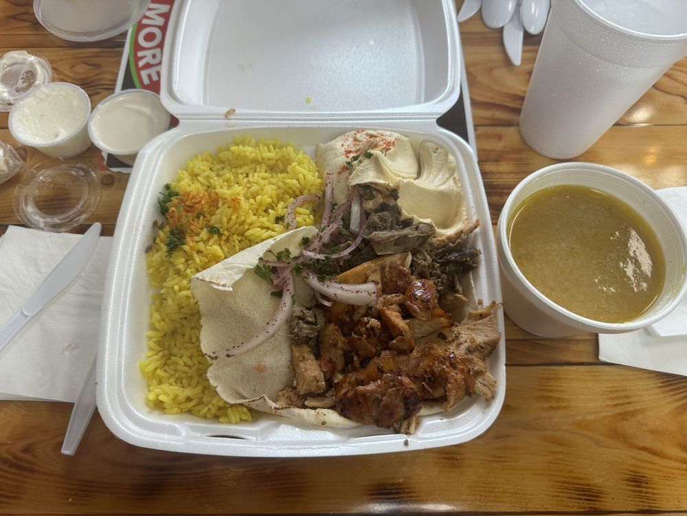 Special serving 10-12 people, this party size meal includes 4 skewers of 4 beef kafta, 4 shish kabob, 4 chicken tawook, beef shawarma, chicken shawarma, (8) falafel, and (8) grape leaves. Served with a exlarge side of hummus, a exlarge side of baba ghanouj, and your choice of soup or salad and rice or fries.